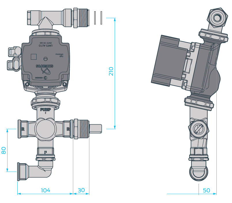 rated 7.5 metre circulating pump, and a flow manifold connection tee piece